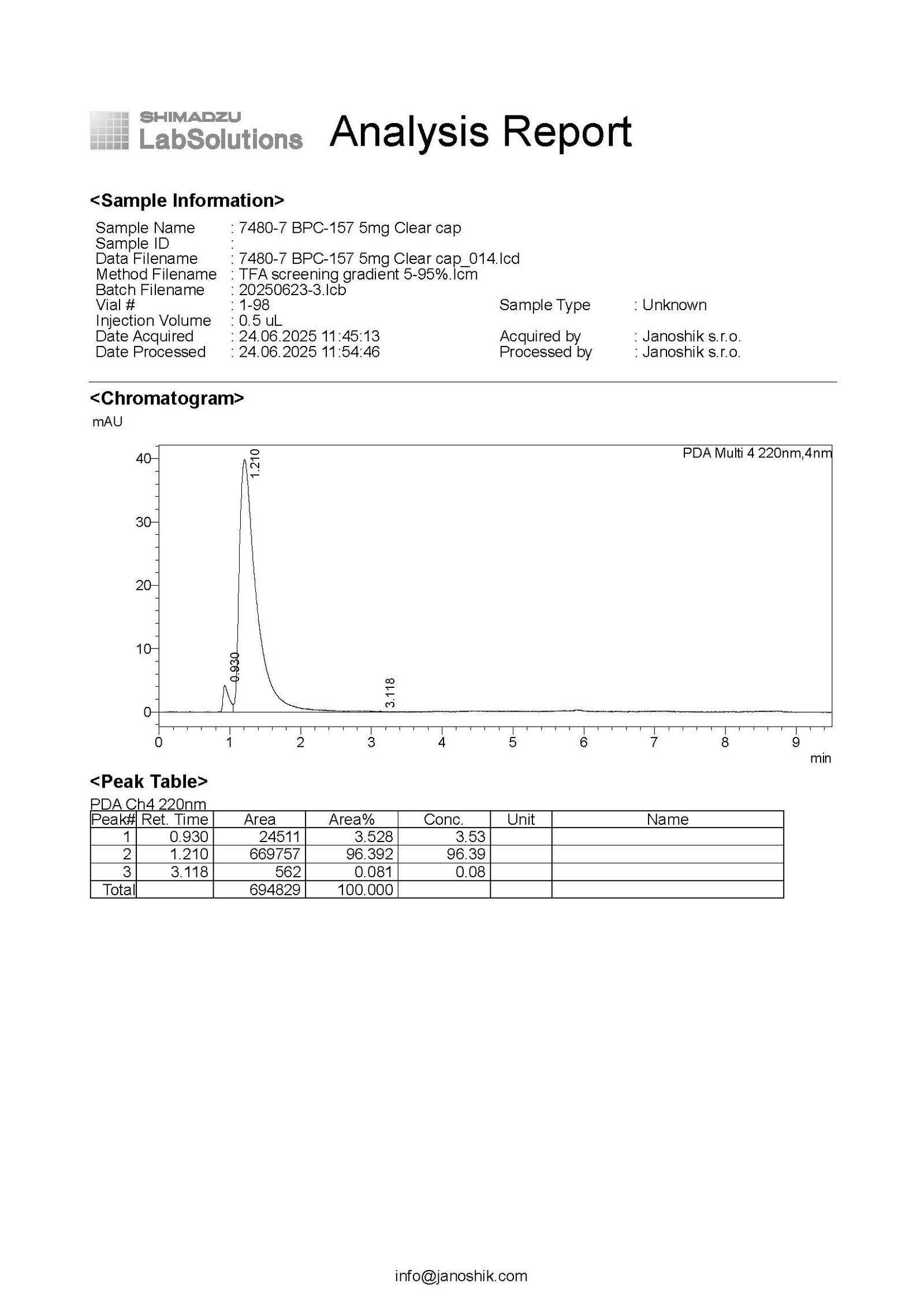 - Contents: 5mg of lyophilized BPC 157 peptide in sterile vial